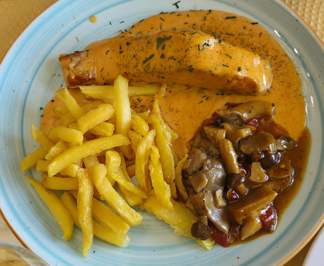 - Lomo con salsa de tomate y patatas fritas