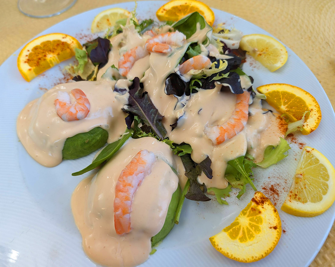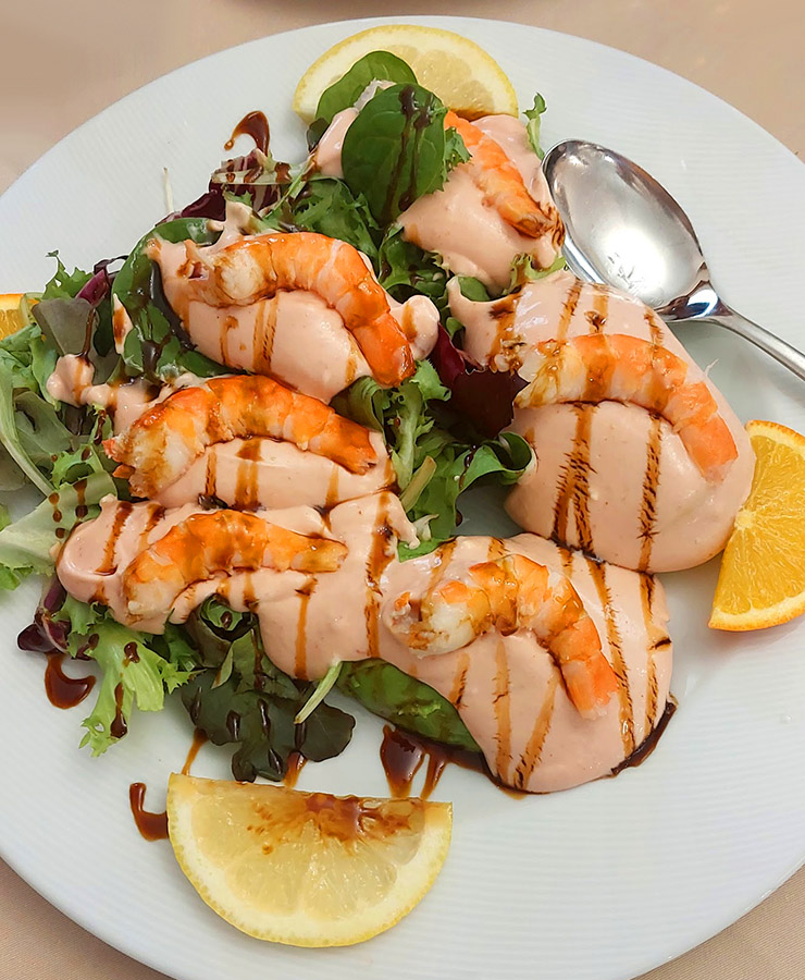 - Ensalada templada (lechuga variada, gulas, gambas, trigueros y salsa malagueña)