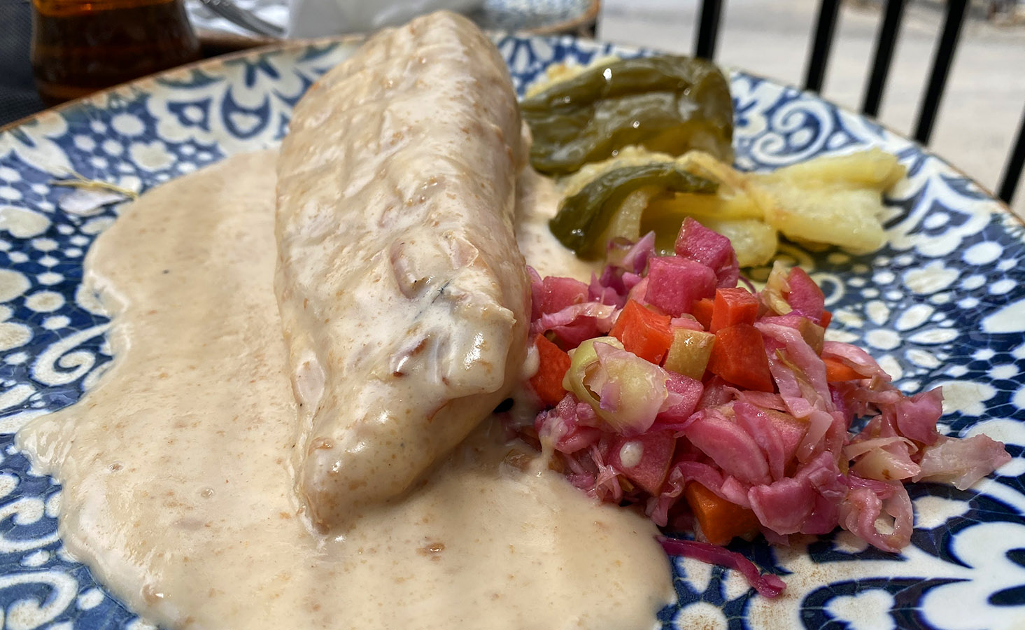 - Pechuga de pollo rellena (rellenas de gambas y flambeadas con salsa de beicon)